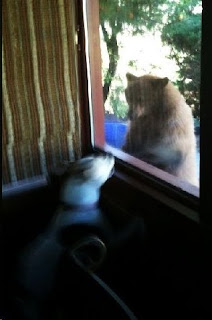 That night after we had gone to bed, we heard a noise and discovered that there was a bear outside (they didn't name our place Bearadise for nothing!) The bears love to visit the "big house" at the top of the hill where Bev and Larry live, but now they have decided to come and visit us.